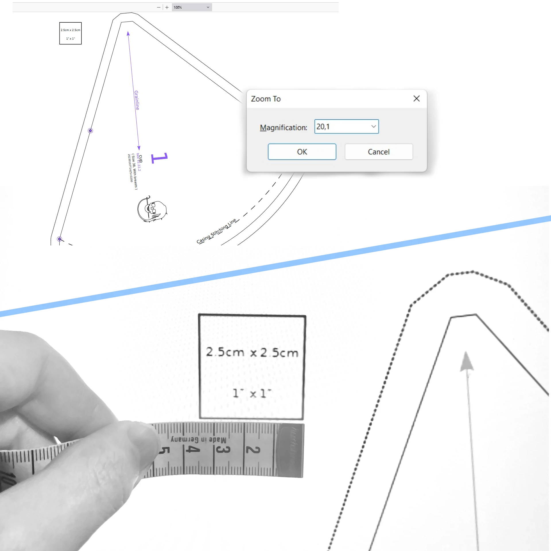 Ensimmäisenä selvitä jokin mitta esim. mittaneliöä tai jokin mitta minkä voit ompelukaavasta selvittää kelvolliseksi heijastetavaksi ja mitoiltaan tunnettavaksi ompelukaavassa.